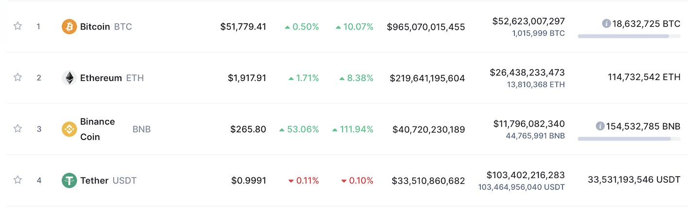 Еще 22 января BNB торговался около $38. За месяц его цена выросла на 431%. Binance Coin уже перегнал Tether по капитализации и теперь занимает 3е место в рейтинге Coinmarketcap.