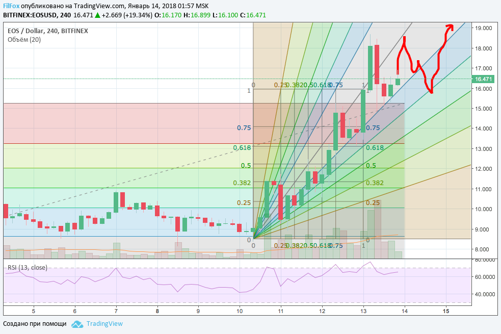 На текущий момент EOS замыкает десятку криптовалют по объёму капитализации имея в своём активе около 10 млрд долларов США, тогда как на конец 2017 года этот показатель составлял всего 5 млрд. долларов. Буквально за две прошедшие недели нового года EOS смог удвоить объём капитализации. Давайте проследим как это происходило на дневном таймфрейме.