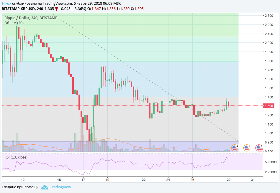 На прошедших выходных цена на Ripple попыталась протестировать уровень сопротивления 78.6% фибо (1.402 USD), но так и не смогла преодолеть этот уровень. Торги проходили в очень узком диапазоне и на малых объёмах. Сигналы для входа на рынок пока отсутствуют.