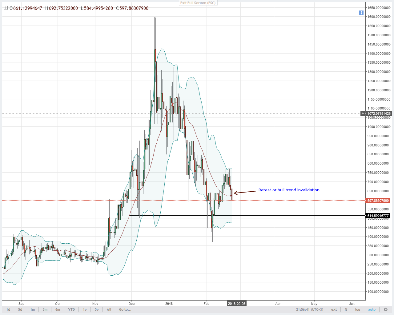 На дневном тайм-фрейме, мы находимся на распутье, и не советовали бы покупать или продавать, пока не появится сигнал окончания медвежьего давления. Помним, что средняя BB и цена возле отметки $620 остается ключевой меткой и нам еще предстоит выяснить будет ли это ретестом либо цена продолжит медвежий тренд, несмотря на бычье настроение, которое было на прошлой неделе. На мой взгляд, покупателям нужно дождаться повышения цены, и если цена будет выше или равняться $620, тогда это может стать сигналом для покупок и свеча просто сделала ре-тест середней BB.