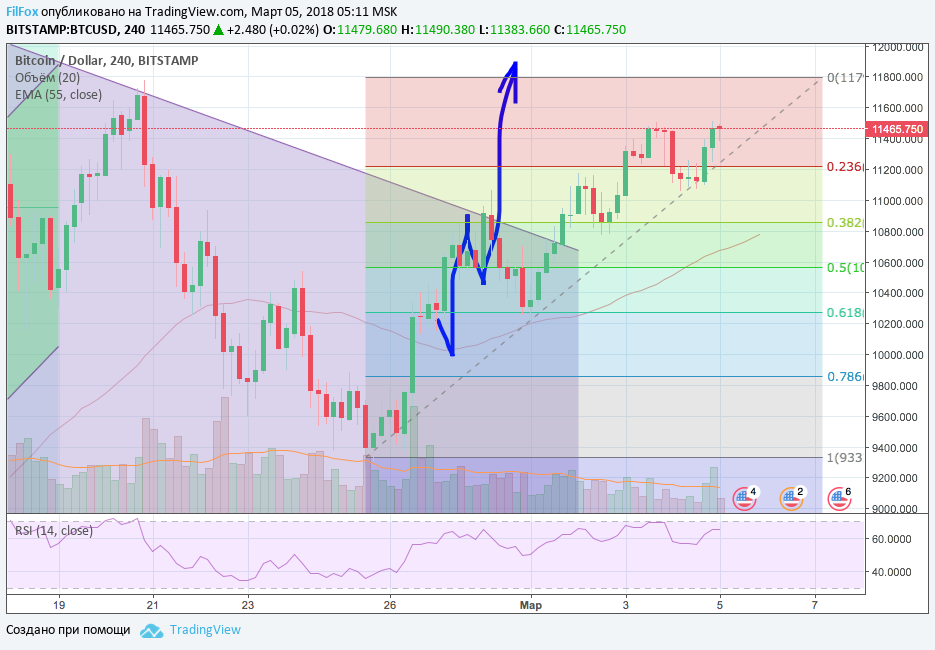 Полагаем, что если цене легко удастся преодолеть этот уровень, то дальнейший рост будет активный. Если же быки замешкаются на этом сильном уровне сопротивления, то рост будет «неспешный», с боковыми консолидациями и откатами. Зато цена основательно и надёжно закрепится выше верхней границы коридора глобального даун-тренда и в ближайшее время не будет тестить психологическую отметку десять тысяч долларов.