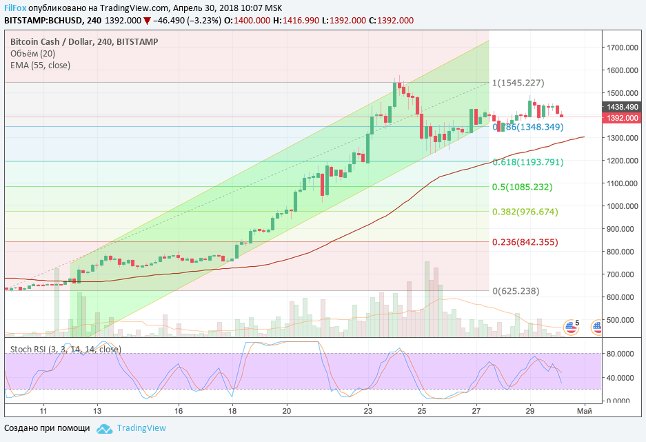 Как мы и предполагали в предыдущем прогнозе 27 апреля, в прошедшие выходные на малых и средних объёмах торгов, Bitcoin Cash двигался вбок, вдоль линии поддержки 1400.00 USD. Сегодня наращивание объёма торгов пока не произошло. На таких объёмах возможен пробой уровня поддержки 1400.00 USD и снижение цены к скользящей средней EMA55 (1300.00 USD)