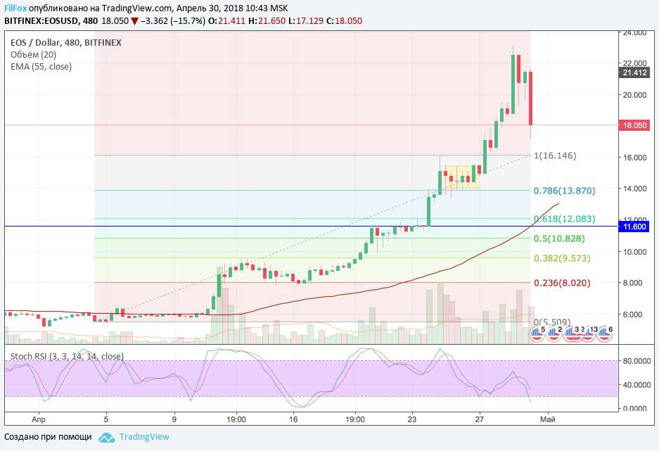 Правда за таким активным ростом сразу последовал откат, который на данный момент ещё не достиг стартового уровня пятницы. Тогда, после пробоя верхней границы «прямоугольника» на уровне 15.50 USD, за счет трёх бычьих импульсных волн, EOS достиг исторического максимума.