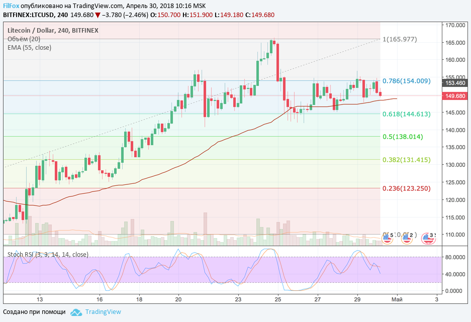 Litecoin все выходные провел в боковом диапазоне между уровнями 61.8% фибо (144.61 USD) и 78.6% фибо (154.00 USD). Понедельник начался с теста на прочность верхней границы, которая выдержала прокол верхнего уровня этого диапазона и отправила цену на ре-тест нижней границы. Однако на пол пути к уровню 61.8% фибо (144.61 USD) находится ещё одна поддержка в виде скользящей средней EMA55, которая вполне может сегодня поиграть в пинг-понг ценой LTC.