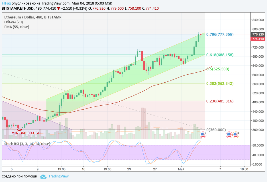 Вчера Ethereum установил майский максимум на отметке 785.00 USD. Это выше максимума апреля, который держался на уровне 711.70 USD. Сейчас цена в техническом откате пытается консолидироваться под уровнем 78.6% фибо (777.36 USD), но пока это плохо получается. В зоне перекупленности стохастик даёт сигнал на продажи, скорее всего цена откатится в область 700 долларов за эфир.