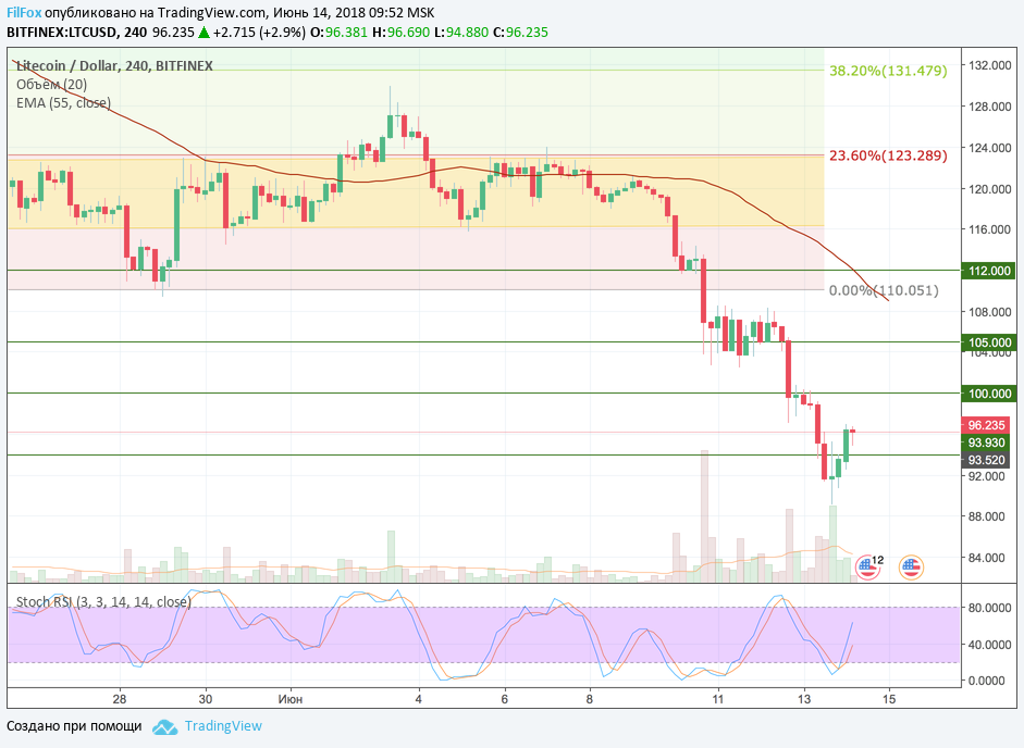 Вчера, после того как пара LTC/USD пробила уровень поддержки 93.93 USD, падение продолжалось, пока цена не опустилась ниже отметки 90.00 USD. Минимум был на уровне 89.14 USD. Только после этого цена LTC решила вернуть упущенное и на малых объёмах пытается восстановится до эпичных 100 долларов. На восьмичасовом графике стохастик показывает рост и ре-тест стодолларового уровня - задача вполне выполнимая. Возможно, цену уже не пустят выше, но отметиться на этом уровне быки просто обязаны!