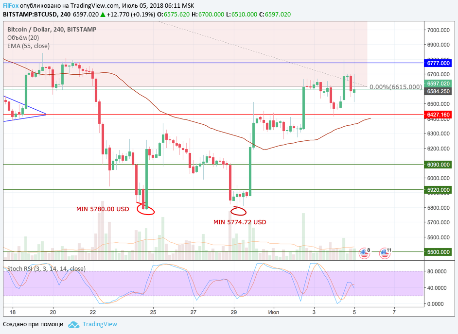 Вчера Bitcoin, используя поддержку скользящей средней EMA55, которая проходит на уровне 6427.16 USD, протестировал ключевое сопротивление 6777.00 USD. Установив максимум в точке 6792.00 USD, цена откатилась к нулевому уровню фибоначчи 6615.00 USD.