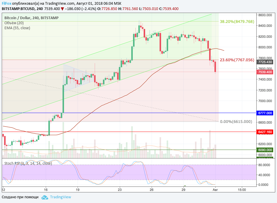 Вчера Bitcoin весь день снижался и пробил сразу два сильных уровня поддержки в виде нижней трендовой линии зелёного коридора и 23.6% фибо (7767.00 USD). Сегодня цена достигла прогнозируемого уровня снижения - область цен 7500.00 USD за биткоин. В ближайшее время от этой зоны возможен отскок и восстановление к уровню фибоначчи 23.6% (7767.00 USD). Если объёмы покупок будут ниже средних, то пробить этот уровень сопротивления с первого раза не получится. Тогда снижение продолжится в область 7400.00 USD.