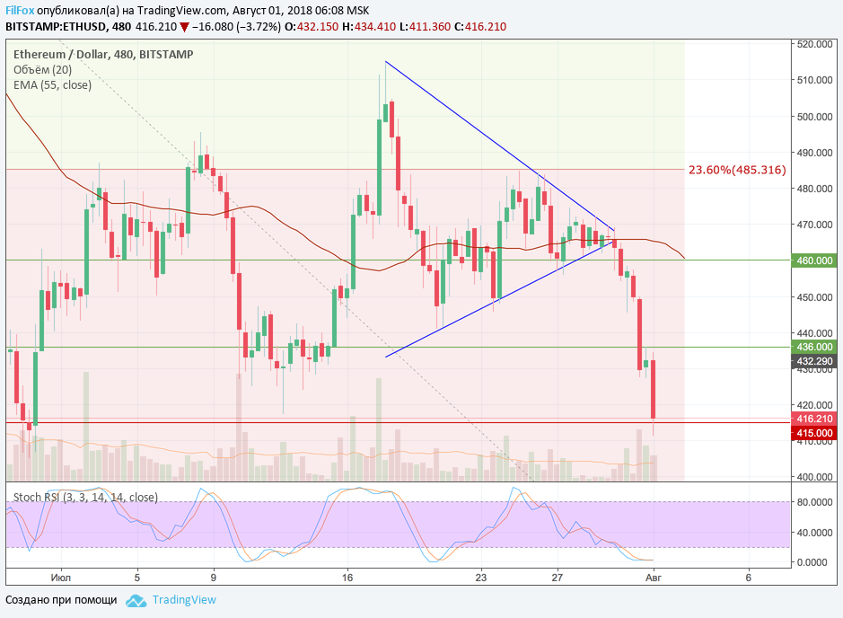 Вчера, продолжая снижение, Ethereum пробил важный уровень поддержки 436.00 USD и установил минимум на отметке 427.00 USD. В завершении дня цена пыталась восстановиться к этому уровню, но он отработал как сопротивление и сегодня пара ETH/USD продолжает снижение к очередной поддержке 415 USD. Полагаем, что этот уровень приостановит снижение и цена сможет восстановиться к предыдущему уровню 436.00 USD. В ближайшее время пара может зависнуть во флэте между этими двумя уровнями.