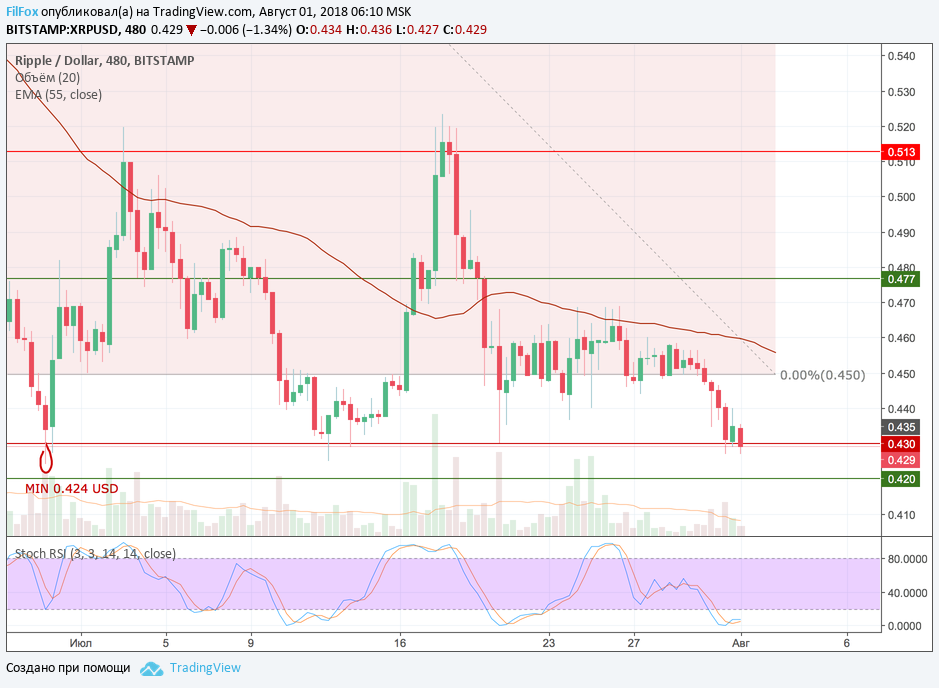 Вчера Ripple проколол уровень поддержки 0.430 USD и, после формирования сигнала стохастика на покупку, цена начала восстанавливаться. В области 0.440 USD восстановление прекратилось. Полагаем, что сегодня пара попытается консолидироваться над уровенем поддержки 0.430 USD.