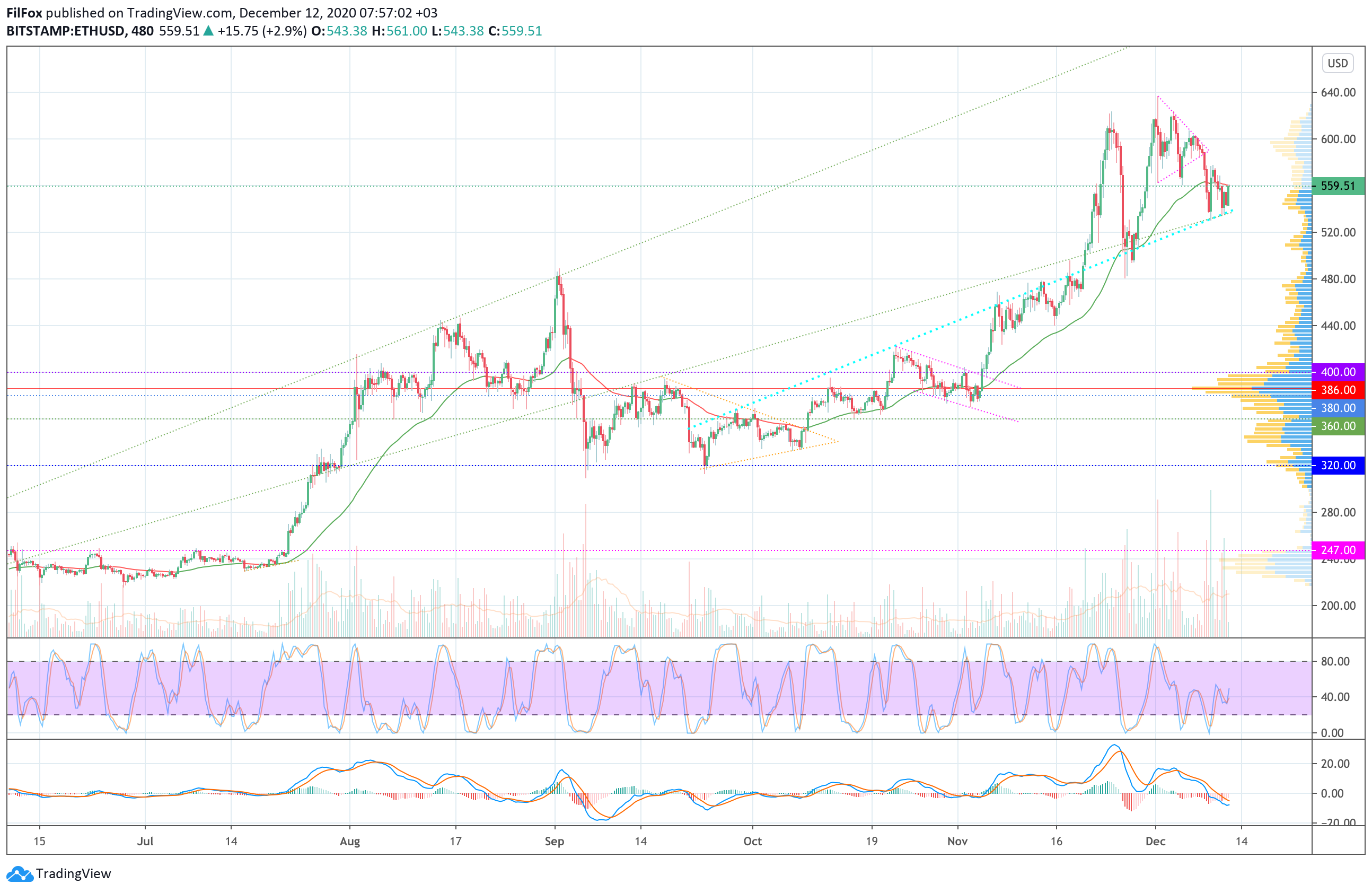 На восьмичасовом тайм-фрейме видно, как нижняя граница зелёного канала удержала цену эфира в восходящем коридоре. Продавцы не смогли продавить двойную поддержку в районе пересечения голубой и зелёной линии тренда, и пара отскочила к скользящей средней EMA55.