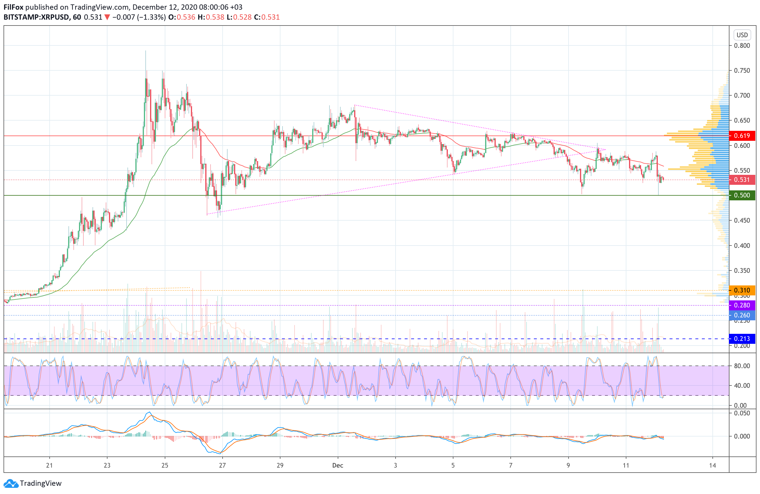 Вчера, во второй половине дня, в районе отметки 0.535 USD, покупатели нащупали поддержку и до конца дня восстановили цену Ripple выше уровня часовой EMA55.