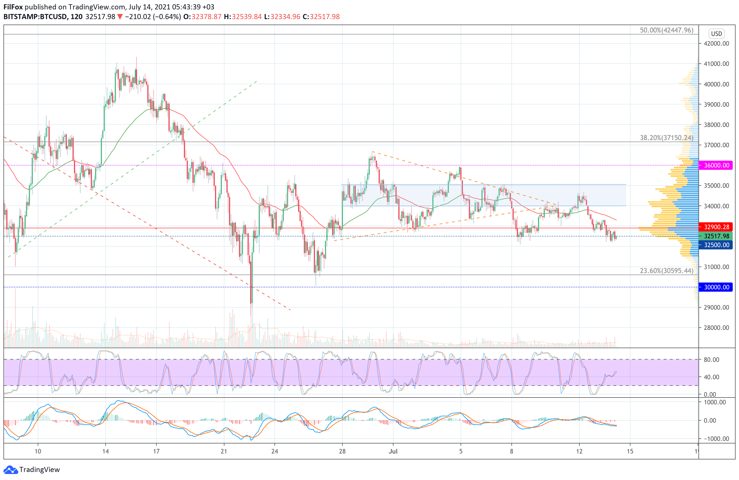 Вчера цена биткоина не смогла восстановиться в область двухчасовой EMA55. Слабость покупателей в области средних цен спровоцировала медвежий импульс, в результате которого цена проколола поддержку 32500.00 USD и достигла уровня 32190.00 USD.
