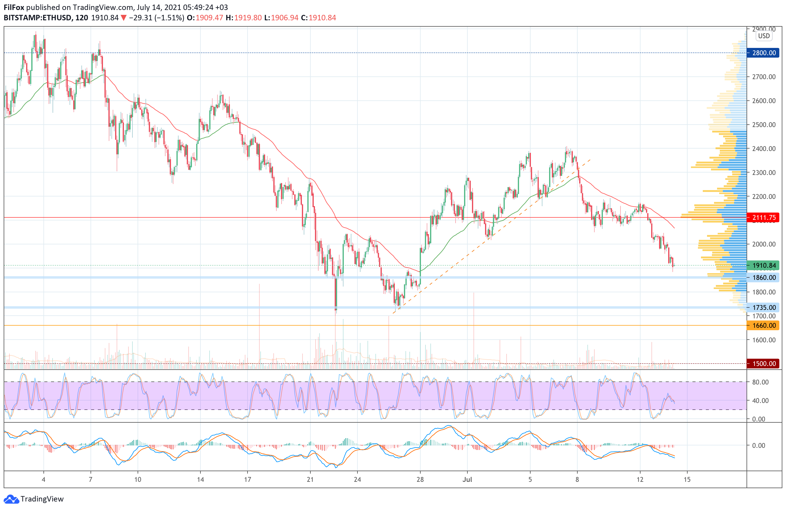 Сегодня утром снижение продолжится к голубой поддержке 1860.00 USD. В течение дня покупатели попытаются остановить падение и вернуть цену эфира в область две тысячи долларов за монету, но пока не ясно смогут ли они отбить очередную атаку продавцов.