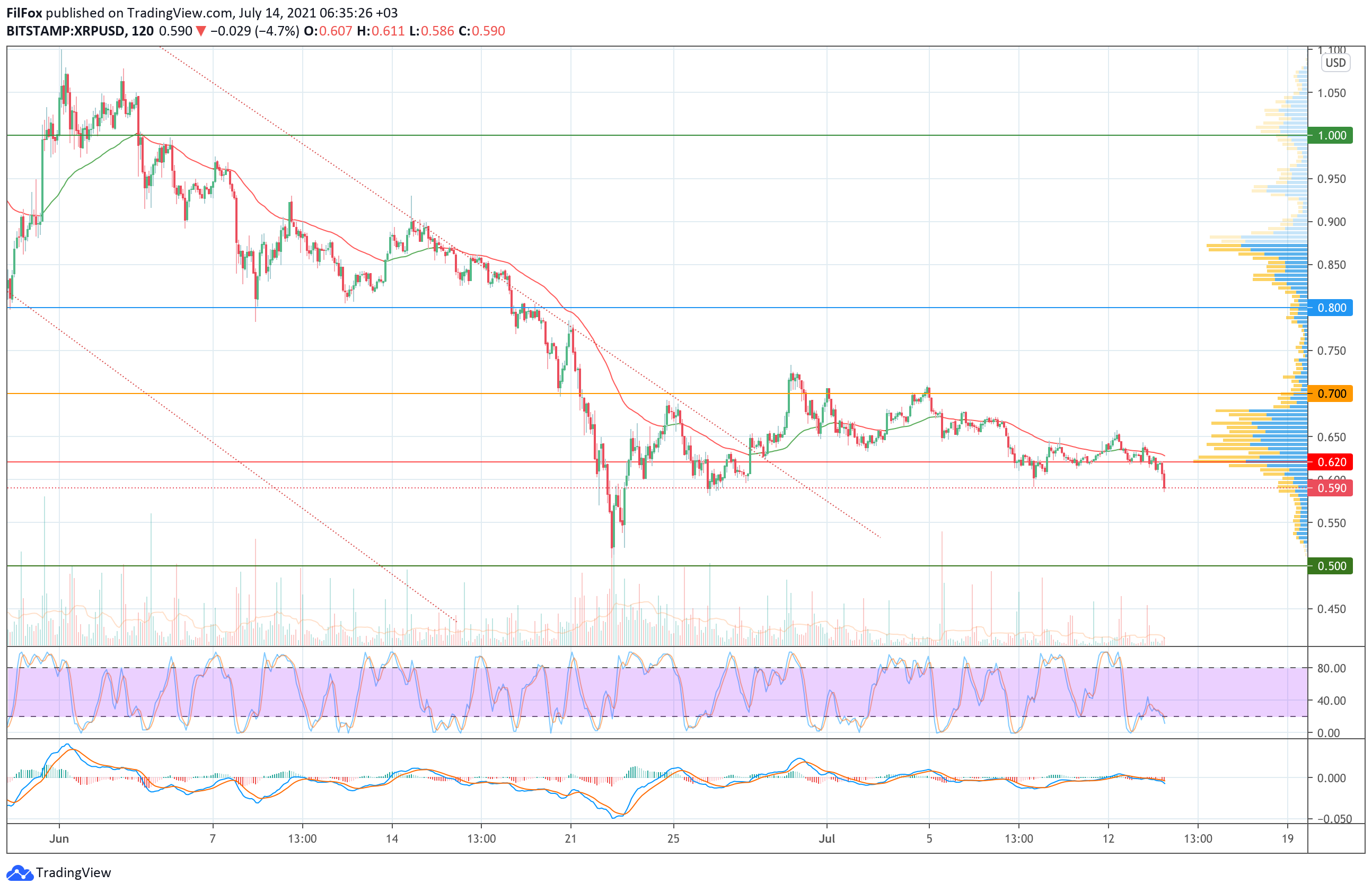 Вчера утром слабый рост цены XRP не был поддержан крупными объёмами, и пара не смогла закрепиться выше двухчасовой EMA55.