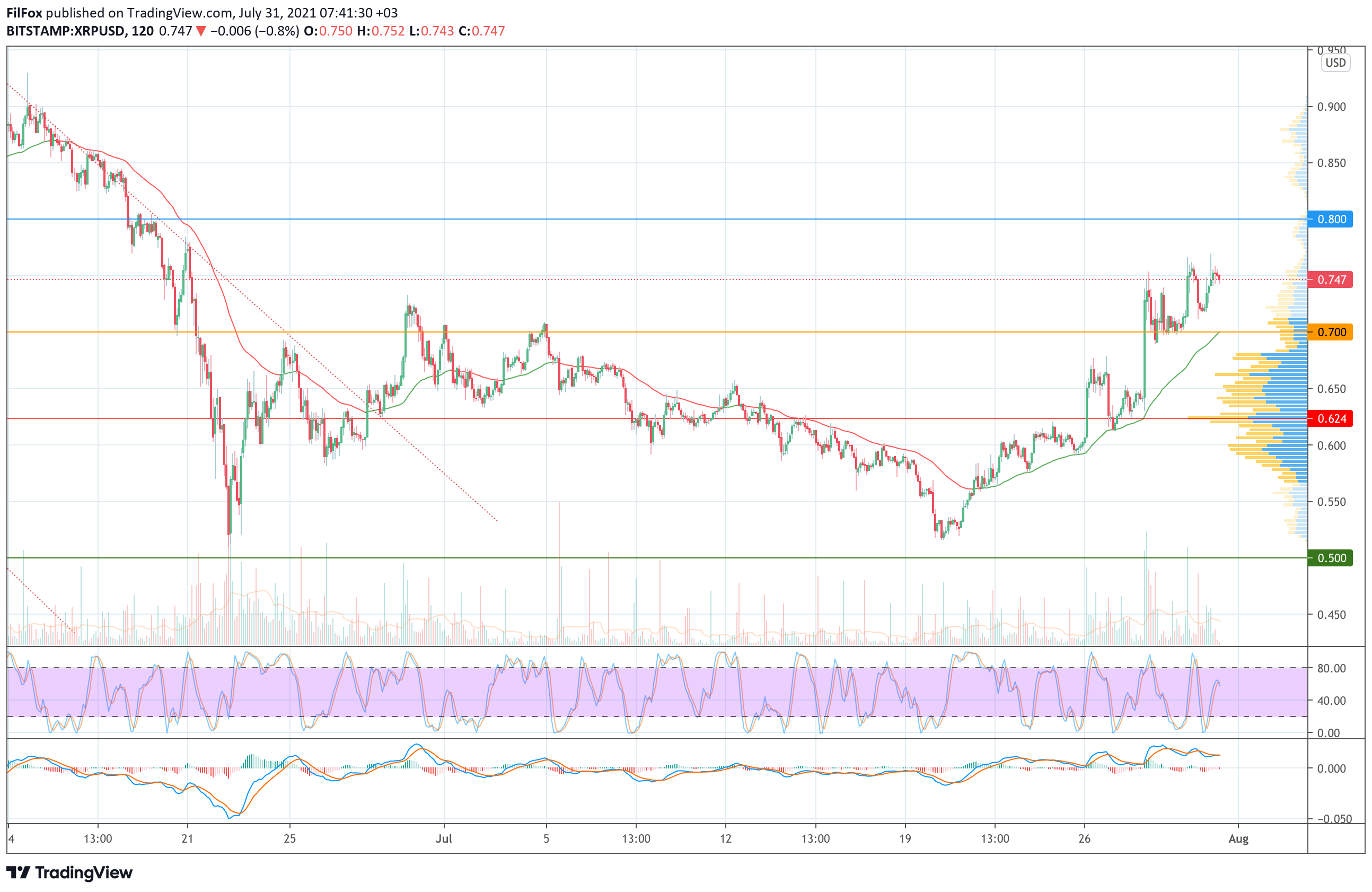 В настоящий момент снижение замедлилось, и если покупатели нарастят объёмы, то им удастся протестировать целевую отметку 0.800 USD. С другой стороны, учитывая перекупленность рынка можно предположить, что откат может достигнуть уровня средних цен, а в начале новой недели цена XRP вернётся к линии POC (0.624 USD).