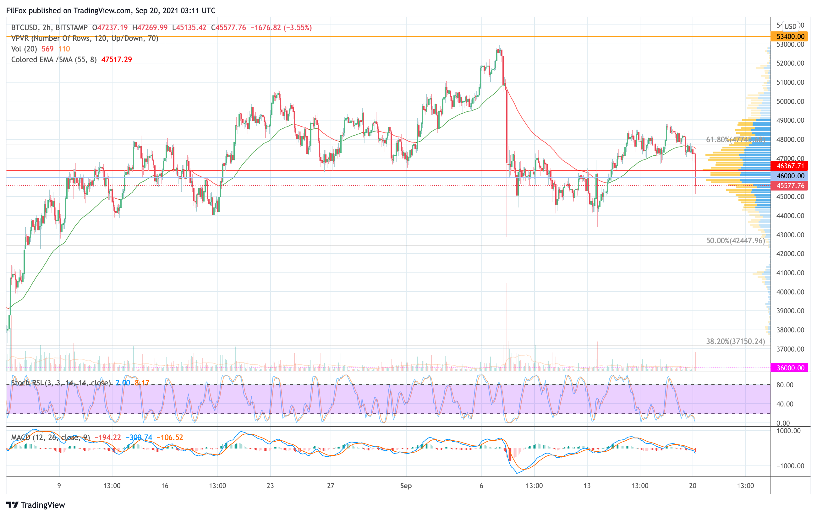 На сегодняшнее утро цена BTC уже успела проколоть поддержку 46000.00 USD, установив минимум в районе отметки 45135.00 USD. В случае ажиотажной паники на рынке не исключен мощный медвежий импульс, который способен протестировать пятидесятипроцентный уровень фибоначчи (42447.96 USD).