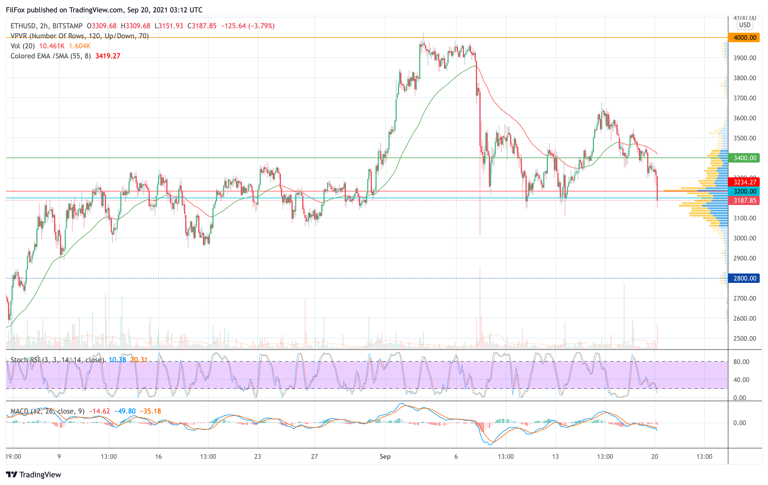 На сегодняшнее утро продавцы прокололи очередной уровень поддержки 3200.00 USD. Возможно, эта поддержка ослабит медвежий натиск и цена ETH отскочит. Однако, в случае увеличения объёмов продаж падение цены продолжится к психологической отметке 3000.00 USD.