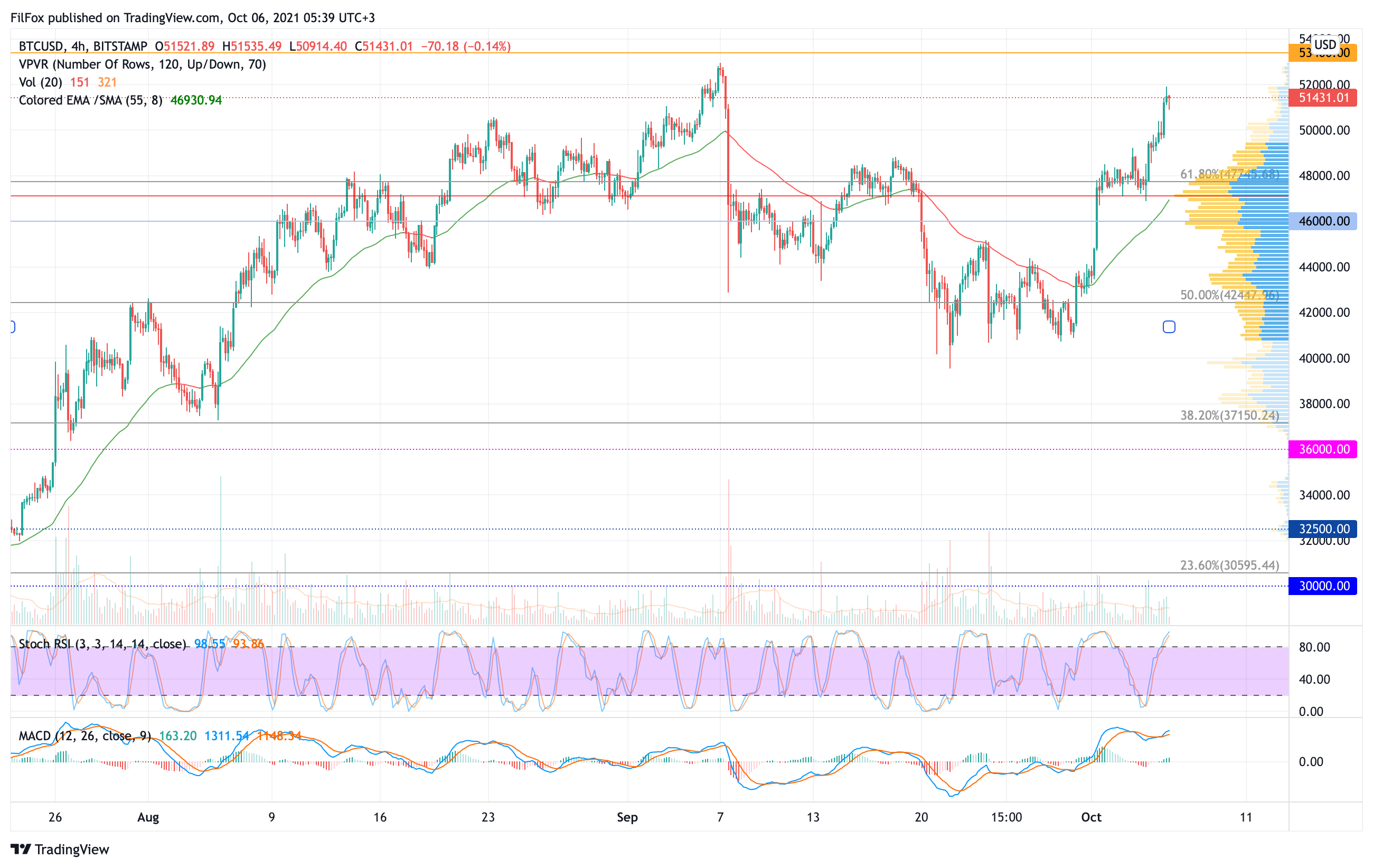 Вчера покупатели сохранили свою активность и цена биткоина продолжила рост. Днём пара проколола психологический уровень 50000.00 USD, а в конце дня новый бычий импульс поднял цену BTC к отметке 52000.00 USD.