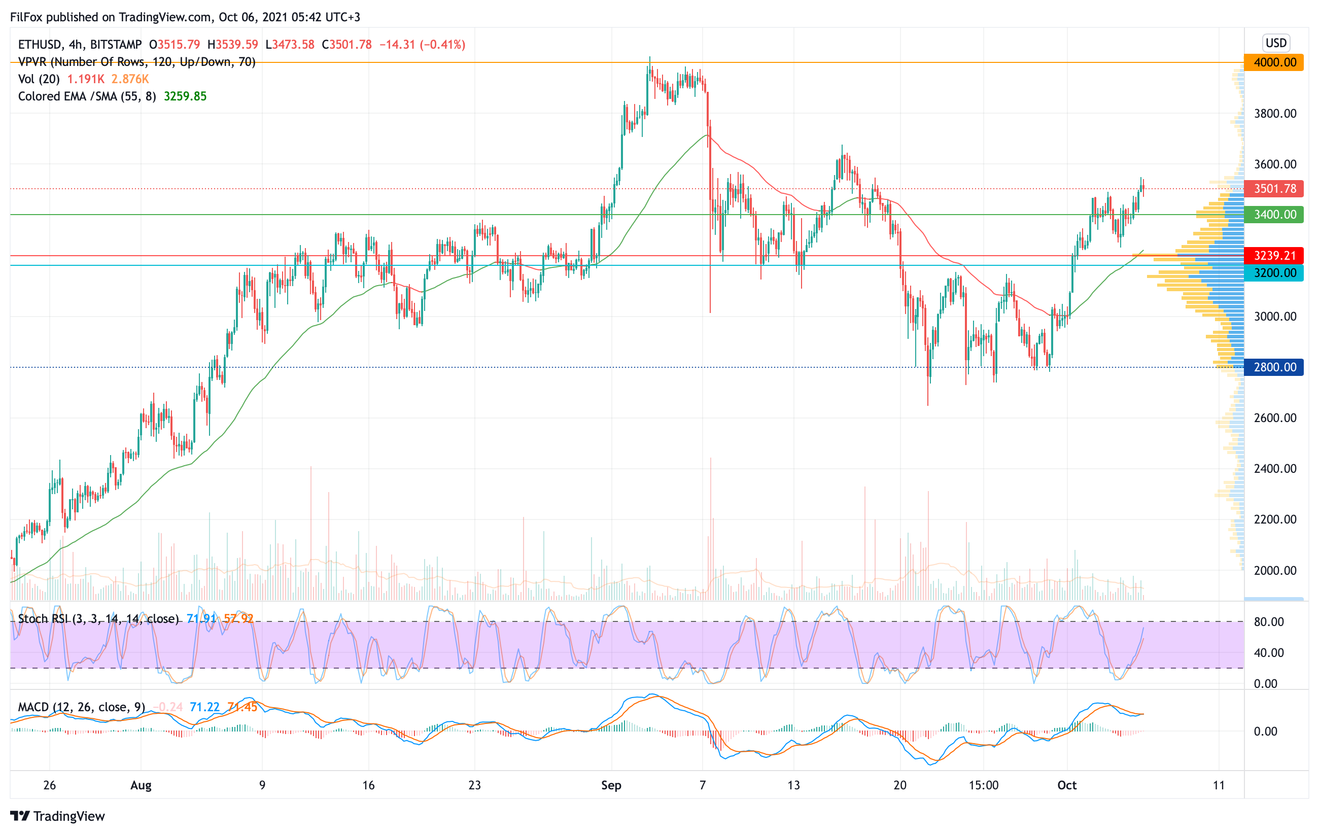 Вчера в первой половине дня медвежье давление отсутствовало и цена Ethereum последовала в рост за криптовалютным флагманом, к сопротивлению на уровне 3500.00 USD. Поздно ночью слабый бычий импульс проколол это сопротивление и обозначил месячный максимум в районе отметки 3550.00 USD.