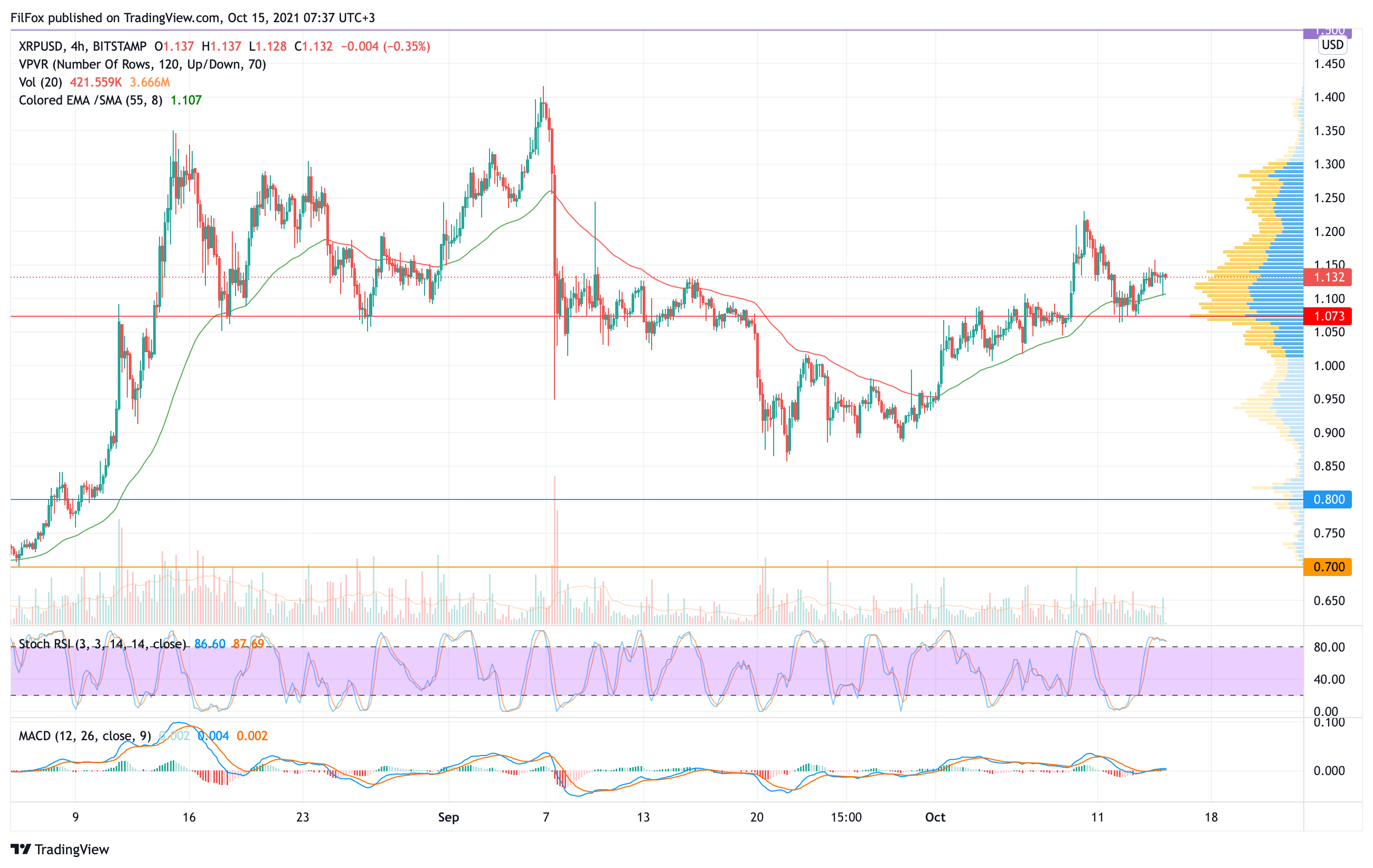 Вчера, после ре-теста уровня 1.140 USD, цена XRP не смогла продолжить рост и консолидировалась в боковом направлении. Сегодня ночью медведи попытались отбросить пару в область средних цен, но пробить четырёхчасовую EMA55 не получилось.