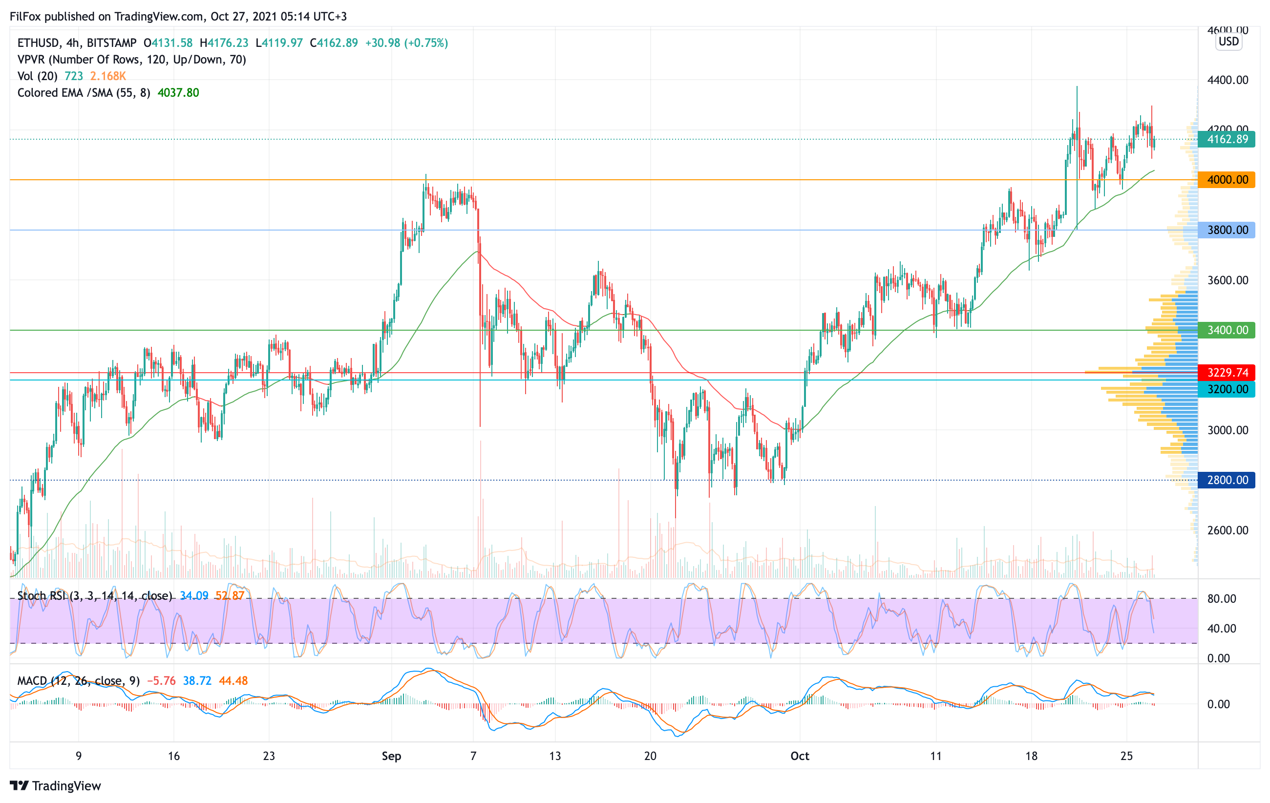 Вчера, после отката цены Ethereum ниже отметки 4200.00 USD, покупатели смогли восстановить пару в зону недельного максимума и обновить его в районе отметки 4300.00 USD.