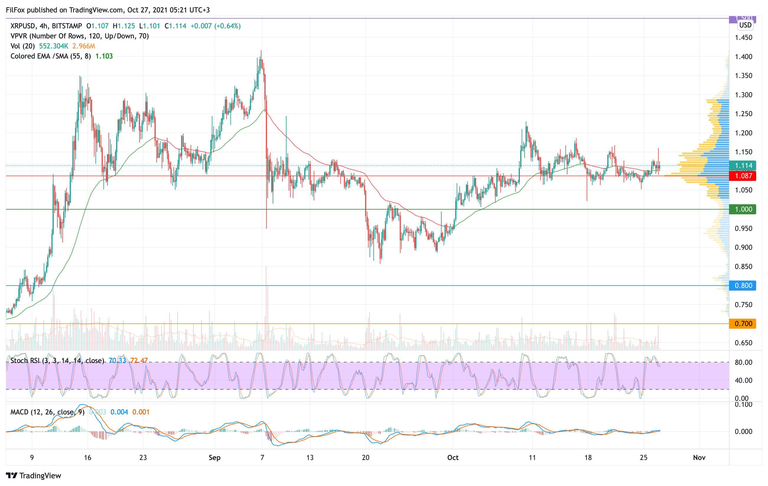 Вчера утром быки споткнулись на слабом сопротивлении 1.120 USD, но к концу дня цена XRP всё-таки смогла протестировать уровень 1.160 USD. Этот умеренный всплеск активности покупателей вызвал медвежий импульс, который сегодня ночью вернул пару к четырёхчасовой EMA55.