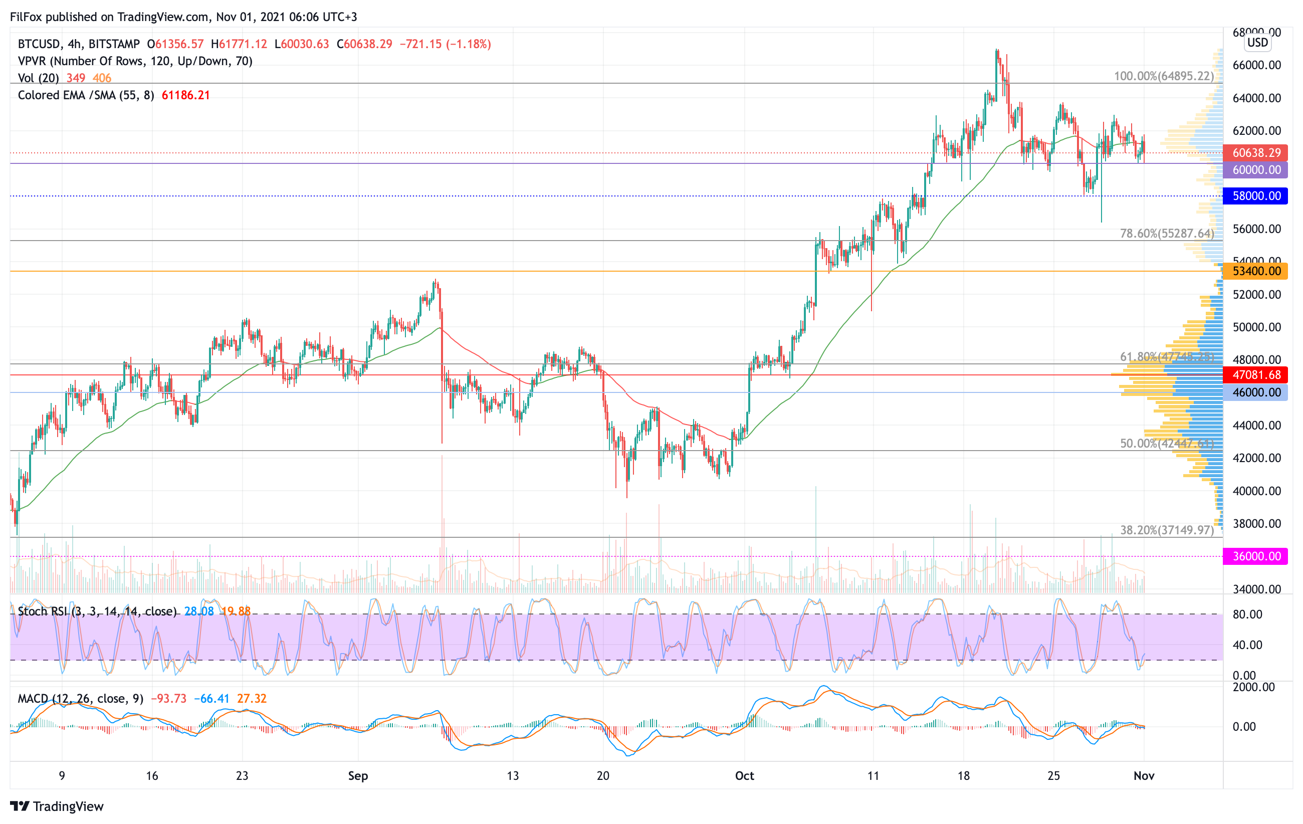 В противном случае - если рубеж устоит, то цена начнёт медленно восстанавливаться к 100% фибо (64895.22 USD).