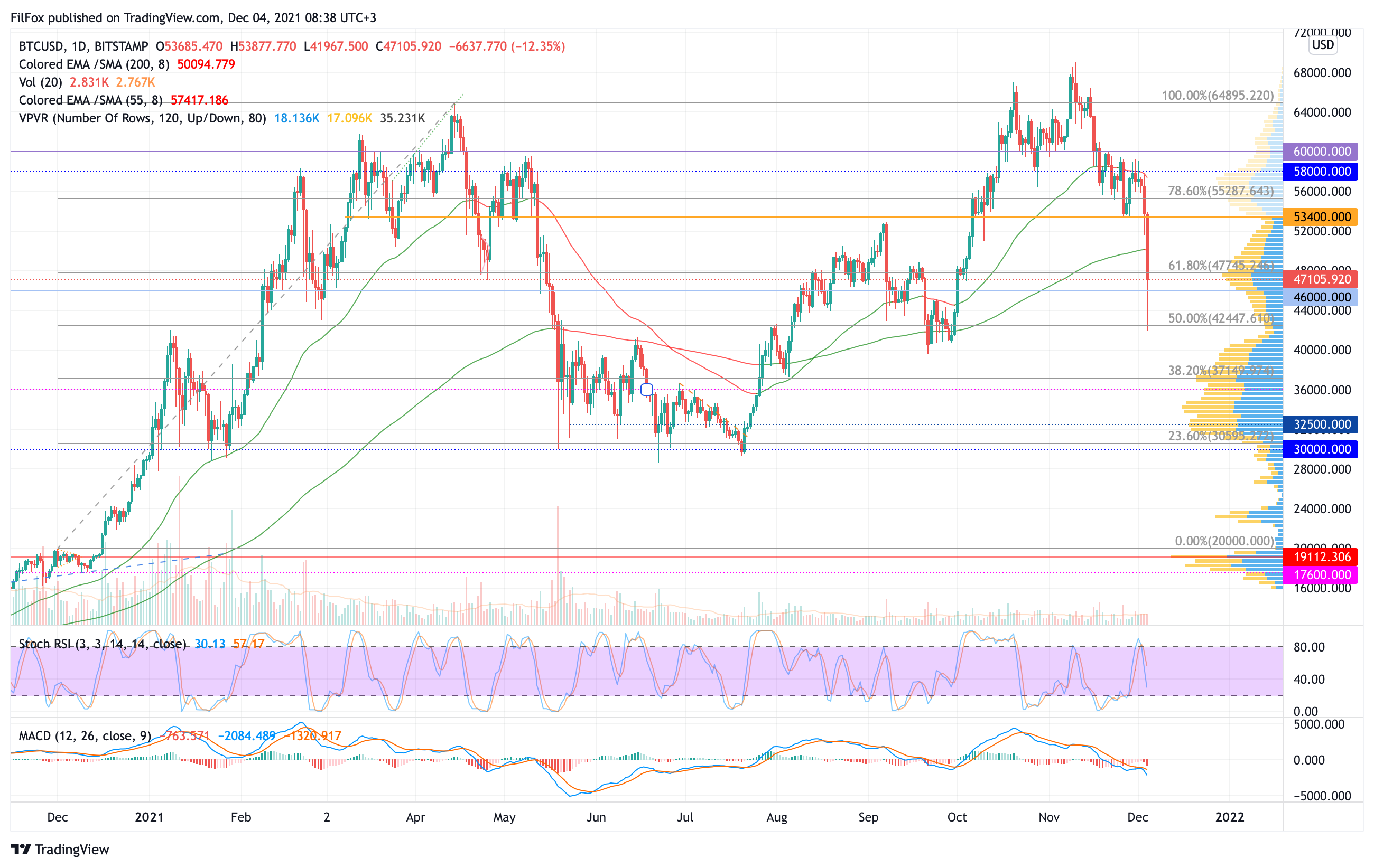 Сегодня ночью давление нарастало. Рано утром мощный медвежий импульс отбросил пару ниже двухсотдневной скользящей средней и цена BTC протестировала пятидесятипроцентный уровень фибоначчи (42447.61 USD). Декабрьский минимум установлен в районе отметки 41970.00 USD. На Bitfinex цена Bitcoin упала ниже отметки 41600.00 USD.