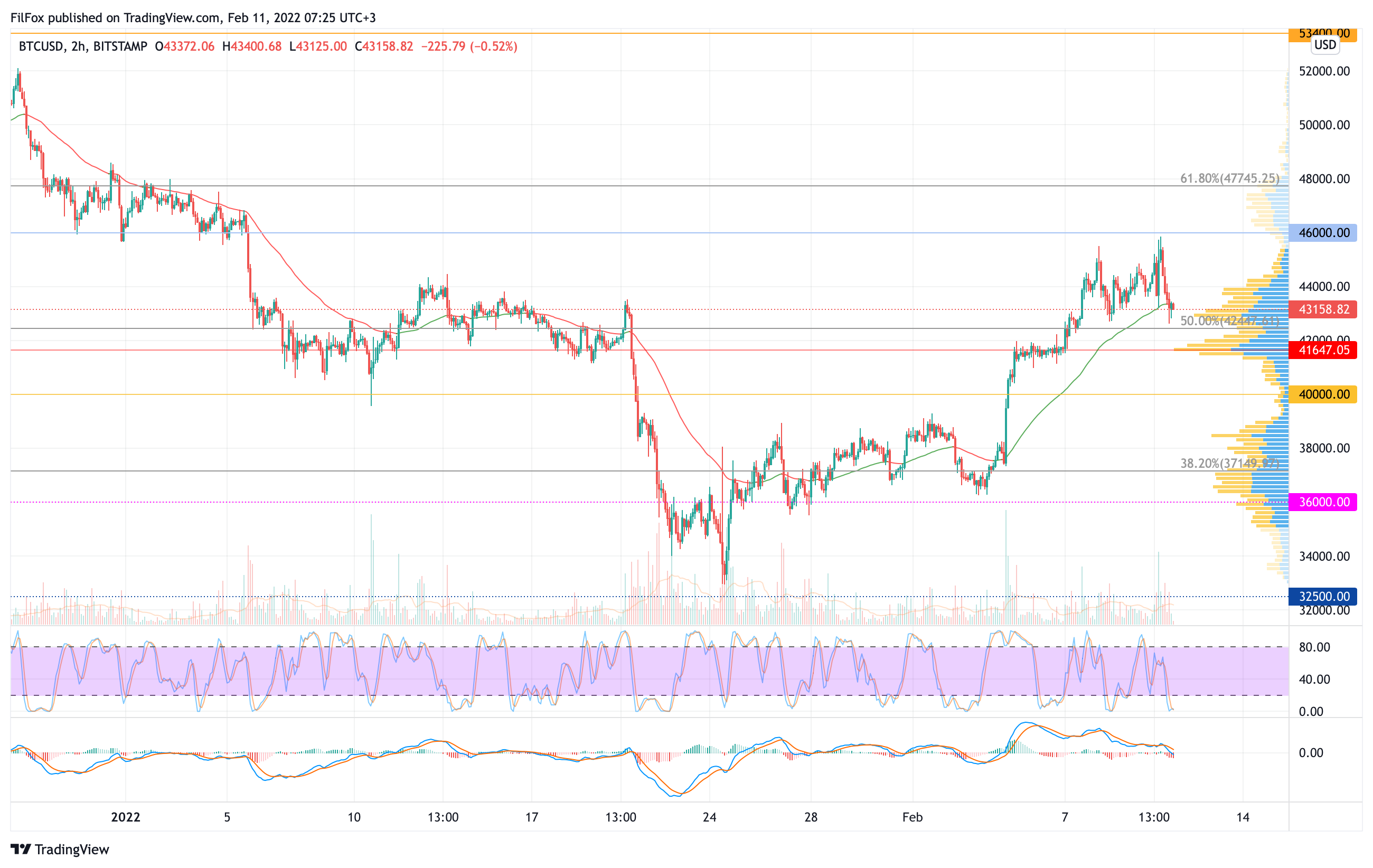 Вчера медведи не позволили цене Bitcoin протестировать сопротивление 46000.00 USD. Закончится ли на этом локальный восходящий тренд?