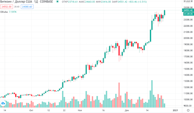 25 декабря цена биткоина снова пробила $24,000 и, на момент публикации, зафиксировала максимум на $24680.