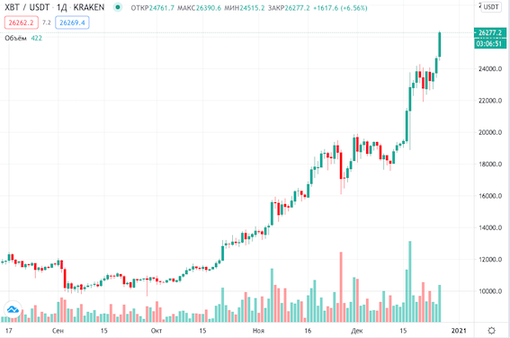 Цена биткоина обновила исторический максимум выше $26,000.