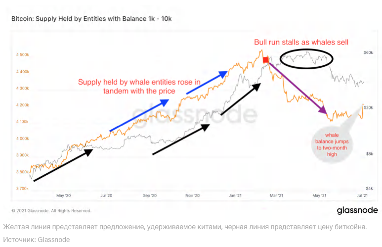 Киты уже показали свою способность влиять на цену BTC. Во время прошлогоднего забега они пополняли свои запасы биткоинов и не сбрасывали их. Но когда они начали продавать биткоин выше $60,000, цена не смогла удержаться и обвалилась до $30,000.