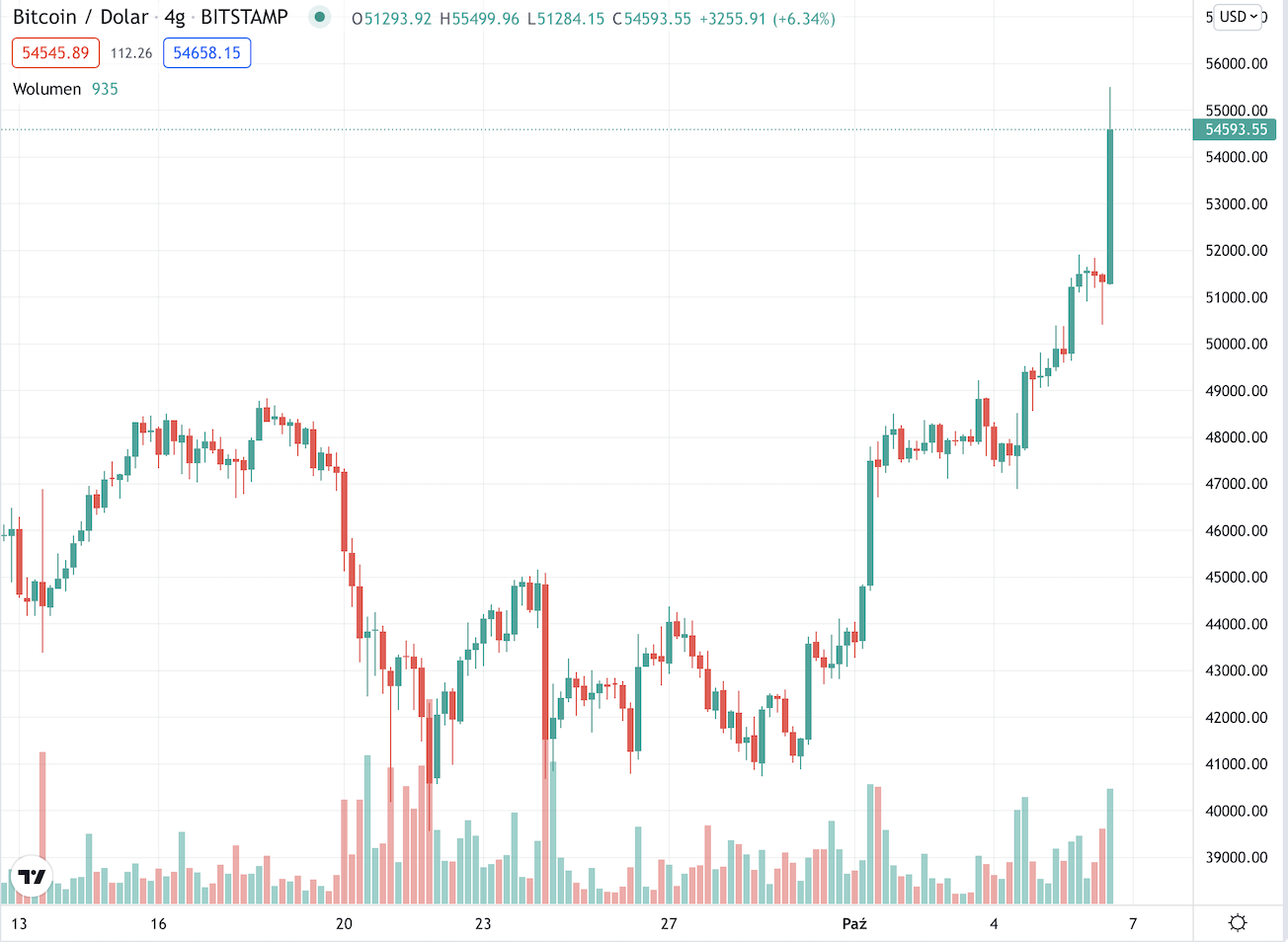 6 октября цена биткоина снова преодолела отметку $55,000.