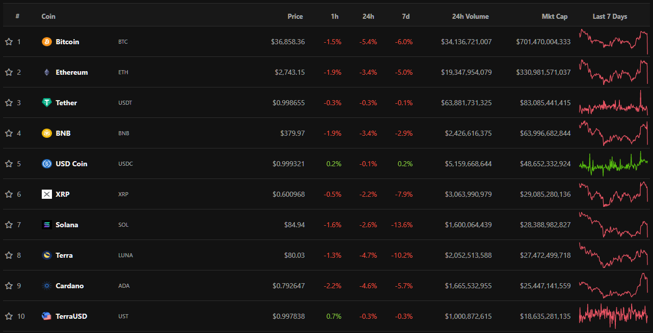 Флагман традиционно потянул за собой остальной рынок. По данным CoinGecko, все активы из топ-10 по капитализации оказались в красной зоне.