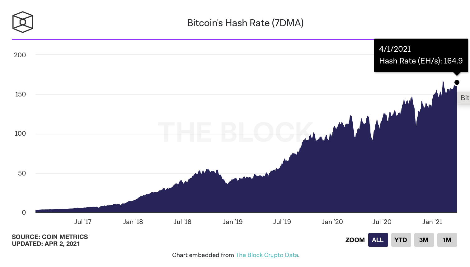 14-дневный средний хешрейт сети вырос с 156 EH/s 20 марта до 165 EH/s. Разница в 9 EH/s демонстрирует, что за последние 2 недели к добыче подключились около 90,000 новых асиков, по мощности эквивалентных AntMiner S19 Pro.