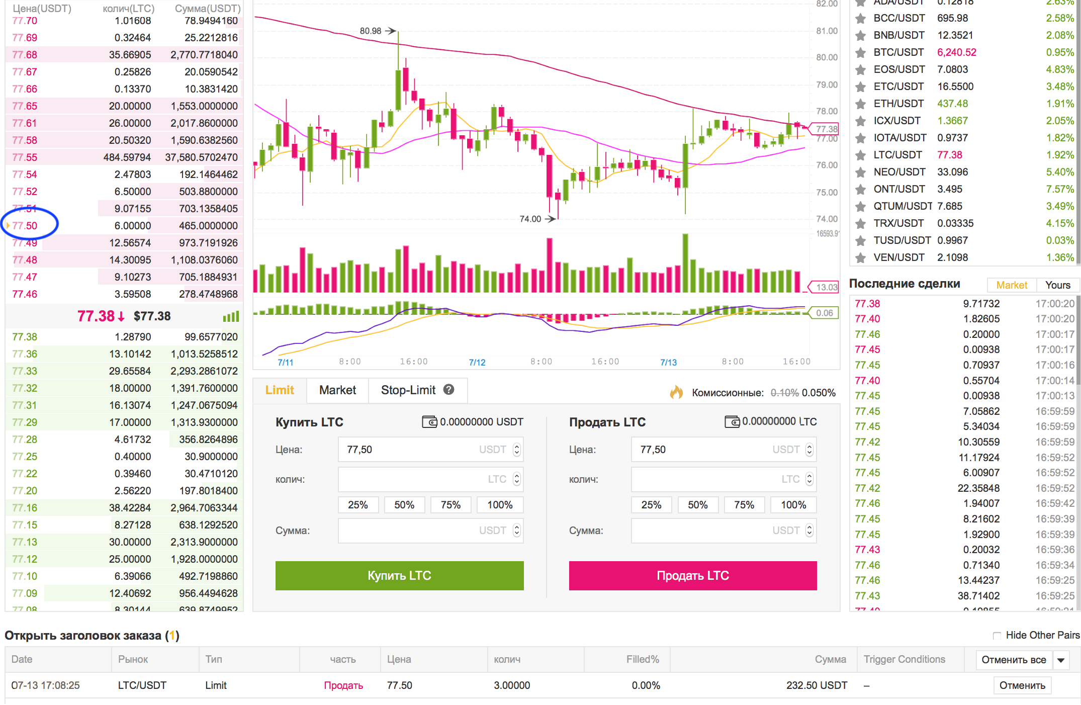 Котировки пары LTC/USDT находятся в диапазоне 77.38 - покупка, 77.46 - продажа. Пробуем выставить лимитный ордер на продажу 3 LTC по курсу 77.50