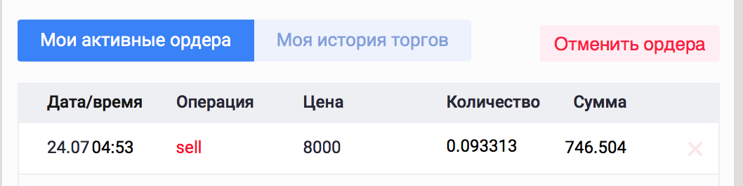 Памятуя о дисциплине при реализации торгового плана и учитывая большую скорость изменения курса, сразу выставляем ордер на продажу 0.093313 BTC по курсу 8000.00